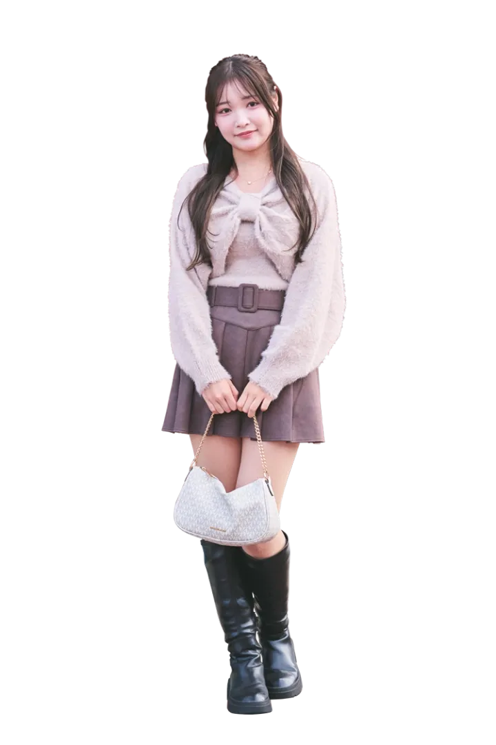 「約5,000円のシャギーボレロと約3,000円のプリーツスカートは、ともにFUNで購入。