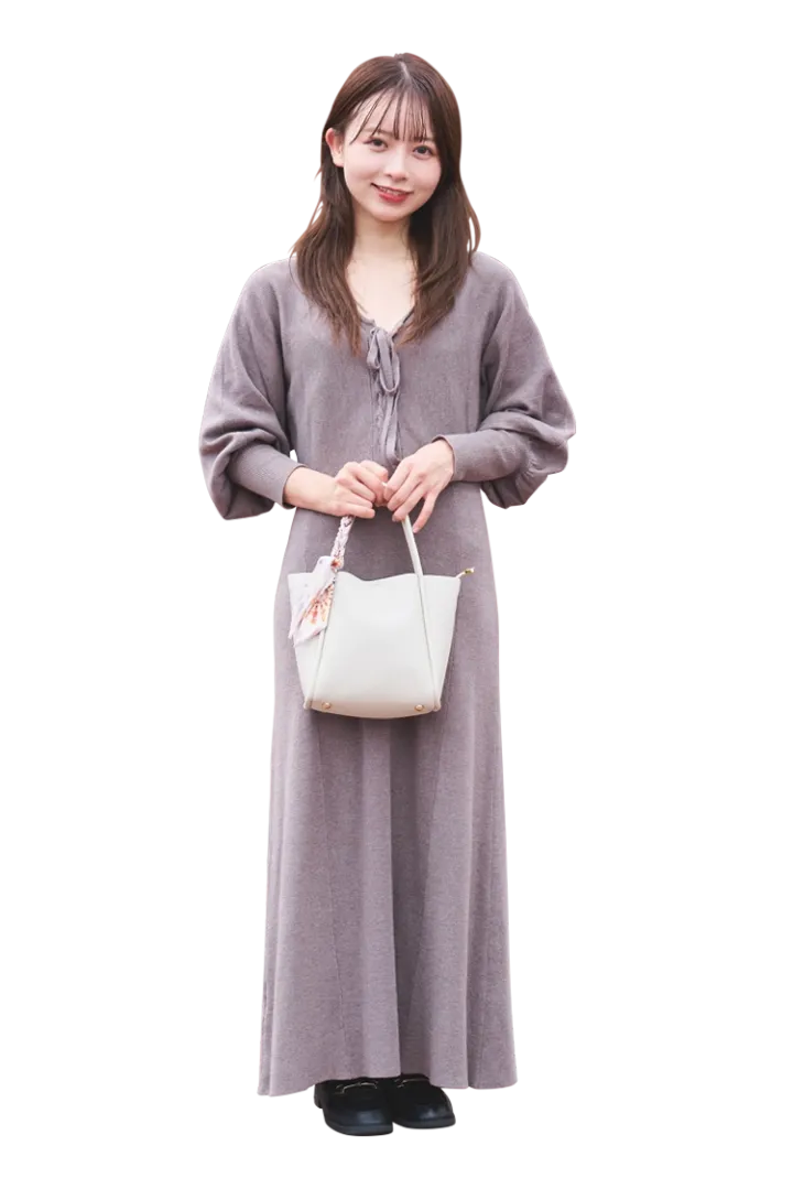 「清楚見えも叶う白のニットワンピはM me emeで約10,000円。オフショルの肌見せで、 メンズをドキッとさせつつ、ツイードバッグで上品っぽさも見せた私的モテコーデ♡