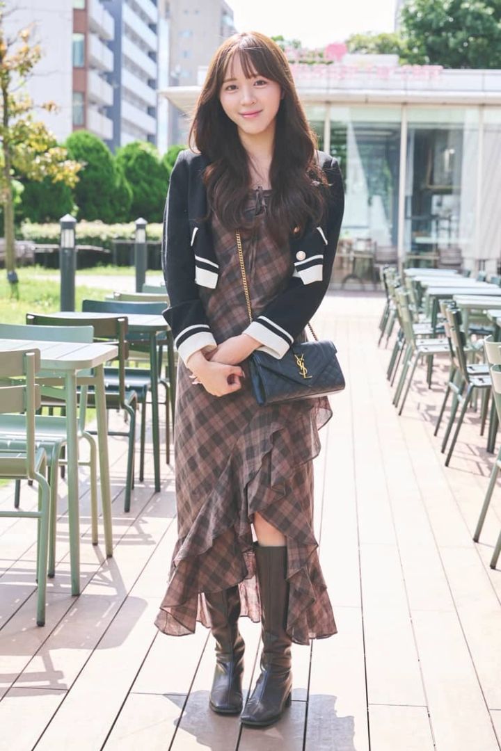 「チェック柄のトップスとフレアースカートは、LIP SERVICE。どちらも10,000円くらいでした。