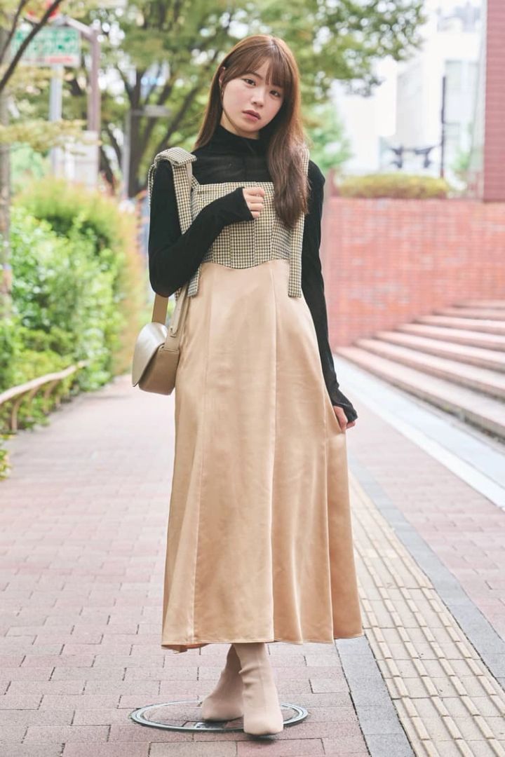 「LILY BROWNで購入した約30,000円のサテンのワンピース。靴もバッグもベージュトーンで統一してぐんっと季節感のあるコーデに。