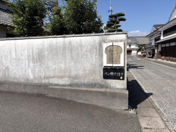 え?「パン焼けてます」ですと?なんて魅力的なお誘い。「こちら」と書いてある矢印の方に吸い込まれるように歩いて行きました。 すると白壁屋敷のパン屋さんがあるではないですか!