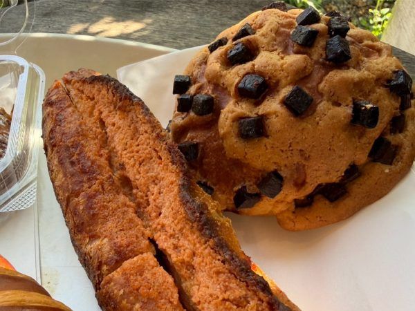チョコチップメロンパンは外はかなり硬めにカリッとしています。中はふんわりでチョコチップがたっぷり入っていて、ほどよい甘さ。子供さん喜びそうです。 明太子フィセルは細めのハード系パンに明太子がたっぷり。表面はパリッと香ばしく、明太子のピリ辛が食欲をそそります。こちらも大人気商品のようで、最後の1個でしたよ。