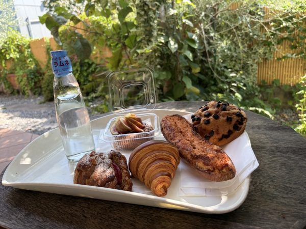 飲み物はラムネをチョイス。(他にコーヒーなどもあります) ラムネの開け方をすっかり忘れていて、開けるのに四苦八苦。でもこんな素敵な庭でパンを食べれるなんてチャンスを逃したくないという思いで頑張って開けましたよ。