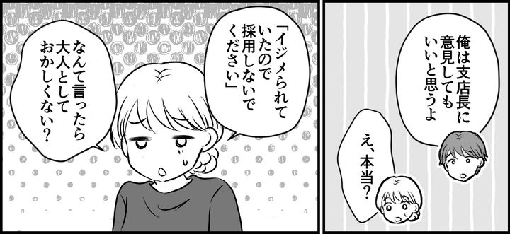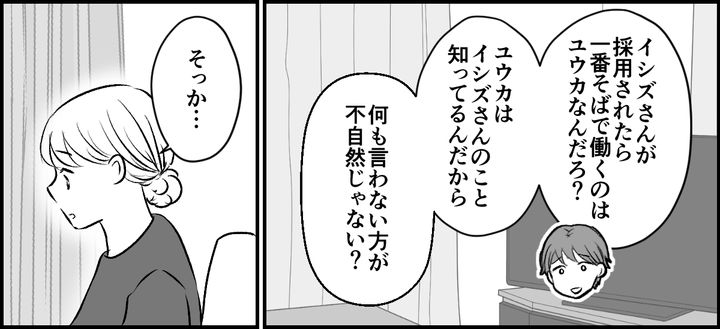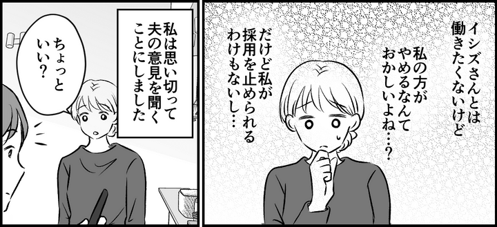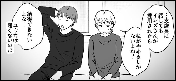 そして私がその悩みを夫に打ち明けると、「一緒に働くのはユウカなんだから、支店長に言うだけ言ってみたら?」「それでもイシズさんが採用されたら、俺も新しい職場を探すよ」と背中を押してくれます。