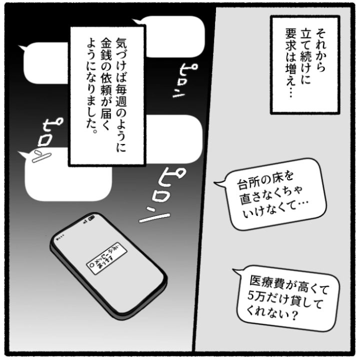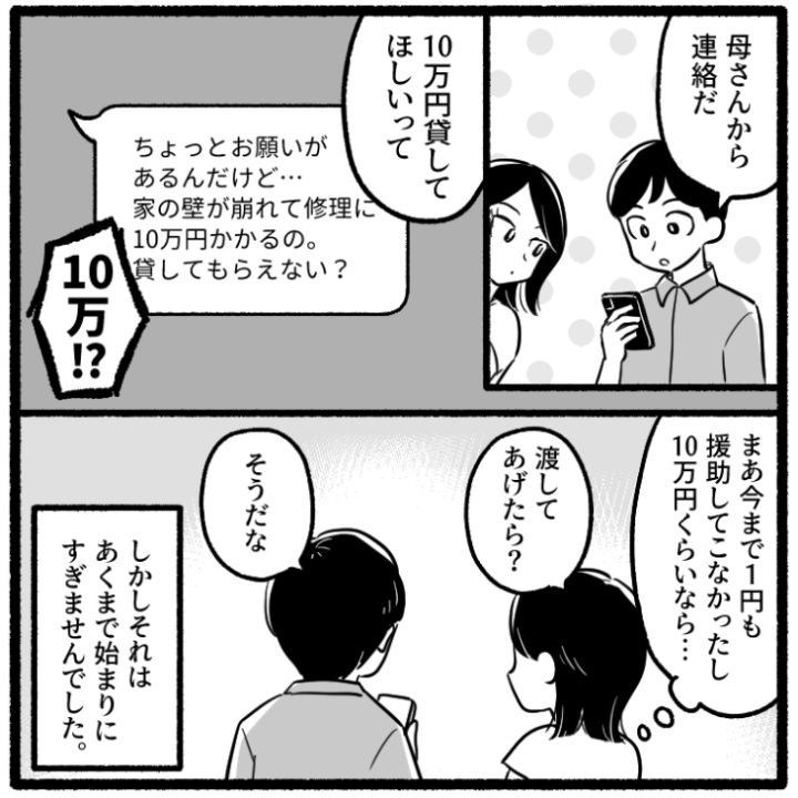 衝撃のエピソードを漫画化!今回はある日をさかいにまとまった金額を要求してくるようになった義母とその衝撃の理由のお話をご紹介します。