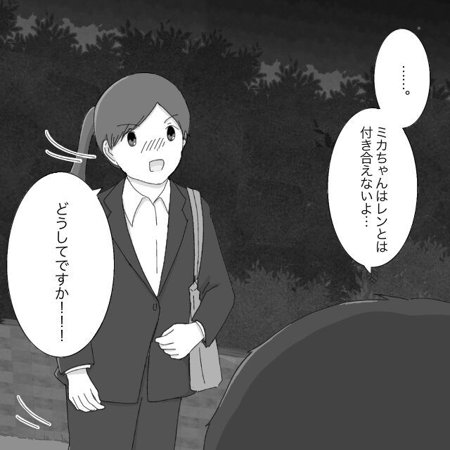 すると、アツシくんは少しためらってから「ミカちゃんはレンとは付き合えないよ・・」と静かに言いました。「どうしてですか!!!」私はついむきになって言い返しました。
