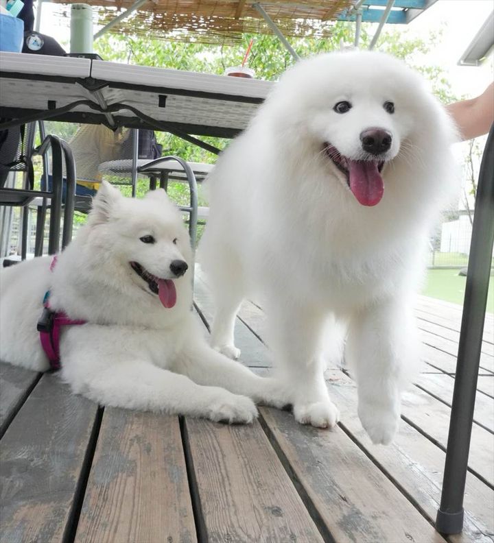 並んでいるのは2頭のサモエドと思いきや・・・、右にいるサモエドの『ダッツ』くんはお耳がありません。 アングルのためかお耳が見えず、白い毛並みも相まって、たしかにアザラシみたいですね。
