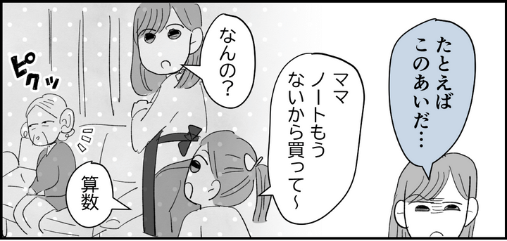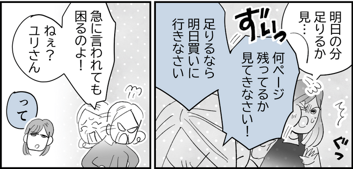 アンナは私に「ノートを買って」と言っています。お金を出すのも、買いに行くのも私です。それなのに義母が「何マスなの? 今言われても困るんだけど」と割り込んできます。