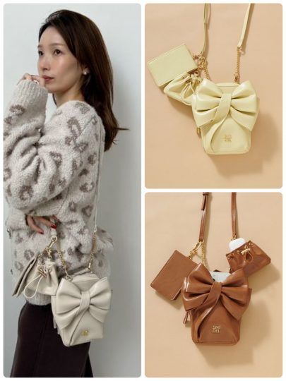 メインとなる立体的なビッグリボンを施したショルダーバッグは、お財布、コスメなどのマストアイテムが収納できるサイズ感。さらにスマートフォンなどをインできるオープンポケット付きだから、必要なとき荷物をサッと取り出せられるんです。付属のカードケースとミニポーチを組み合わせることで、ますます便利に。