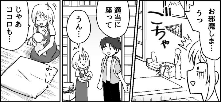 義実家の居間はもので溢れていました。娘を寝かせようとしても畳の上には広げっぱなしのハサミが。そのうえ義母が蹴飛ばした殺虫剤の缶まで転がってきて……。ショウタはまったく気づいていない様子です。