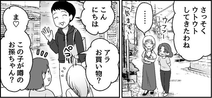 娘がグズり出したので、私は少し外を歩いてくることにしました。義実家の環境から離れたいという気持ちもありました。しかし義母が「私も行く」と言ってついてきます。すると義母と顔見知りのご近所さんが声をかけてきて……。