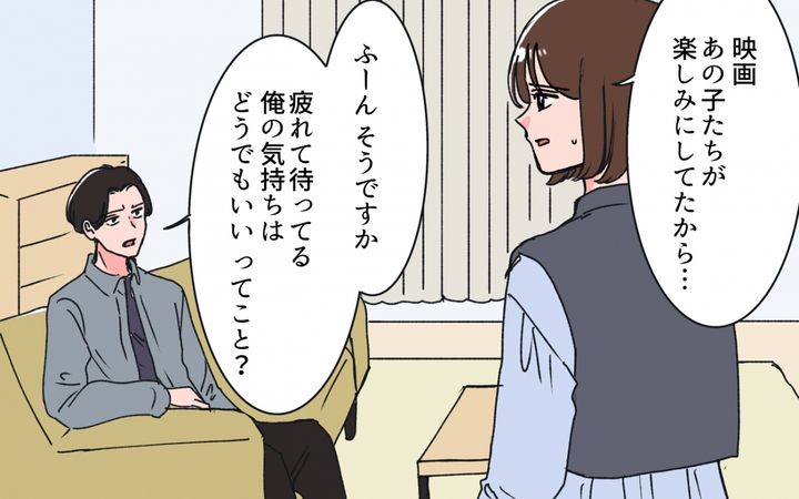 自分から「興味ない」と言って留守番を言い出したのに、夫は映画から帰宅した私に、「自分たちだけ楽しそうで いいですねぇ〜」「パパは今日、ひとりで寂しかったんだぞ〜?」と皮肉たっぷりに言いました。