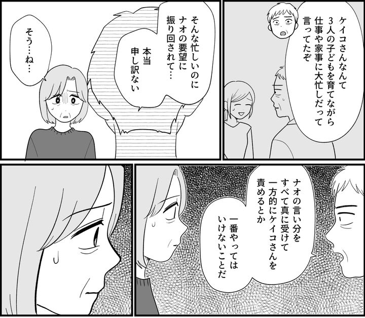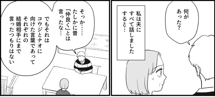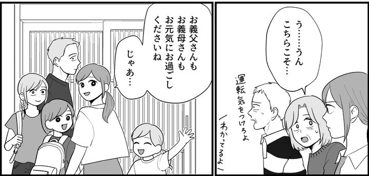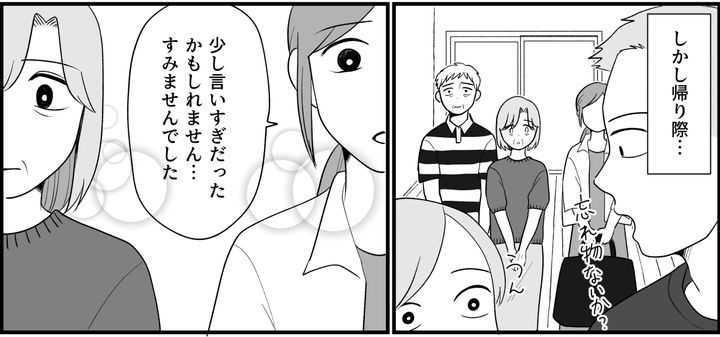 それでも帰り際、ケイコさんがこそっと謝ってくれたのです。そしてケイコさんはお辞儀をして帰っていきました。コウジたちが帰ると、夫が話しかけてきました。「何があった?」私は夫にすべて話しました。