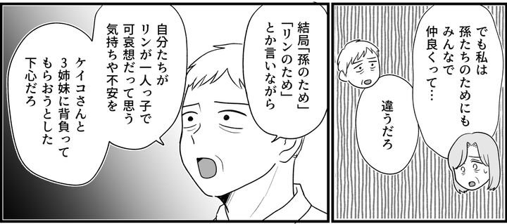 私(コウジとナオの母)は、会社員の夫と2人暮らし。平日はパートなどをしながら悠々自適に暮らしています。長男のコウジは奥さんのケイコさんとの間に3姉妹がいます。コウジより10才年下の長女ナオは、旦那さんのカズナリさんとの間に3才のリンちゃんがいます。コウジとナオの家は車で1時間弱の距離で、ナオがコウジの家に遊びに行くこともある様子。私たち亡き後もきょうだいで仲良く支え合って過ごしていってくれればいいな……。そして孫たち同士も、4姉妹のようにいつまでも仲良く過ごしてほしい……そう願っていたのですが、ケイコさんの考えは違ったようです。