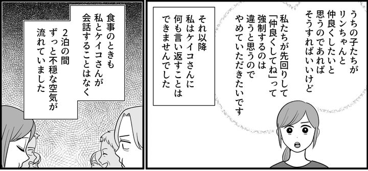 少しケイコさんと言い合いになってしまいました。「3姉妹とリンちゃんを4人で仲良く! と強制するのをやめてほしい」ケイコさんにそう言われて、私は何も言い返すことはできませんでした。食事のときも何だか「シーン」とした雰囲気になってしまうし、せっかくの帰省だったのに変な空気になってしまいました。