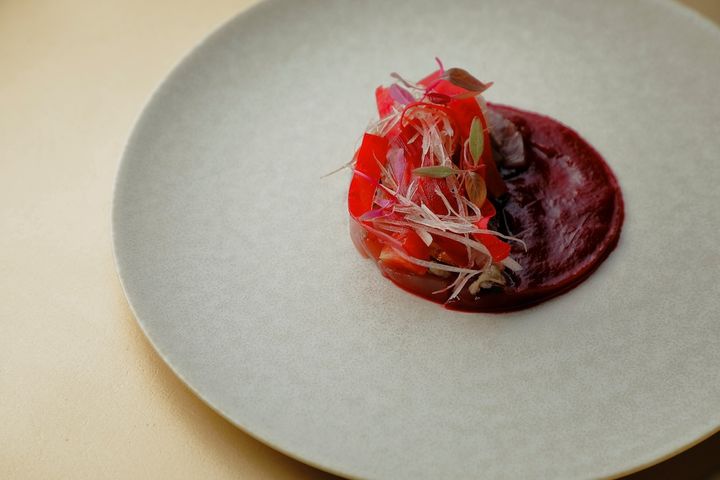 全7皿または全5皿から選べるコースの前菜には、旬の戻り鰹を主役に、トマトとビーツを重ねたカルパッチョが登場。メインディッシュは、京都亀岡産のブランド鴨「七谷鴨」のロースト。赤ワインソースとゴボウの香りが重なり、鴨の旨味を一層引き立てる。ラストを飾るのは、京都城陽産の完熟無花果を多彩な技法で仕立てたデザート。みずみずしい甘みがコースの余韻をやさしく包み込む。