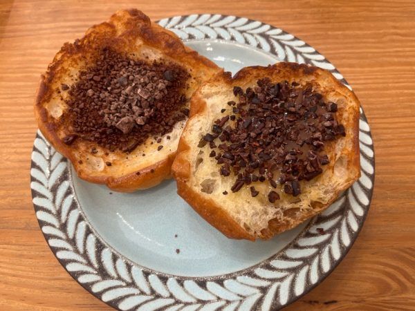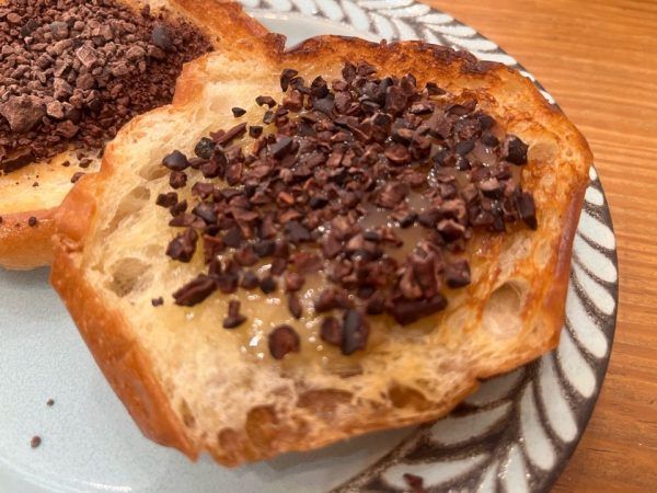 こちらのカカオパン 片面をバターでこんがり焼き上げたモチモチのパンの上に、異なる2種のカカオが乗っているのですが、これが美味しい!!! カカオ70%のグランドショコラを楽しむことが出来る一品で、スイーツとしてはもちろん軽食としてもオススメです。