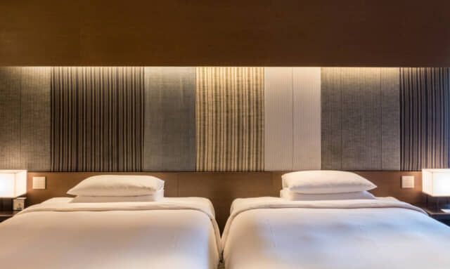それぞれの客室はオーセンティックで落ち着いたデザインと共に、着物の生地が彩るヘッドボードや柔らかな光を投げかける行灯風の照明など、さりげない日本の伝統美を配します。寝具を整えるターンダウンサービスも希望によって対応可能です。