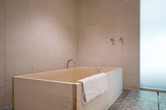 これまでに利用した客室のヒバのバスタブとしては最大の大きさで、2人で入ってもたっぷり余裕がある贅沢さ。湯舟の前は深い緑が広がって解放感満点のバスタイムを楽しめます。