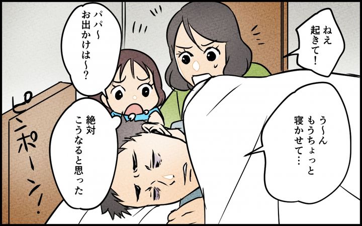 なんか怪しい…。しかも、午後遅くに起きた夫はひとりでどこかへ出かけてしまいました。私と娘を待たせておいて、「今日はナシで」ってなんなのよ…!