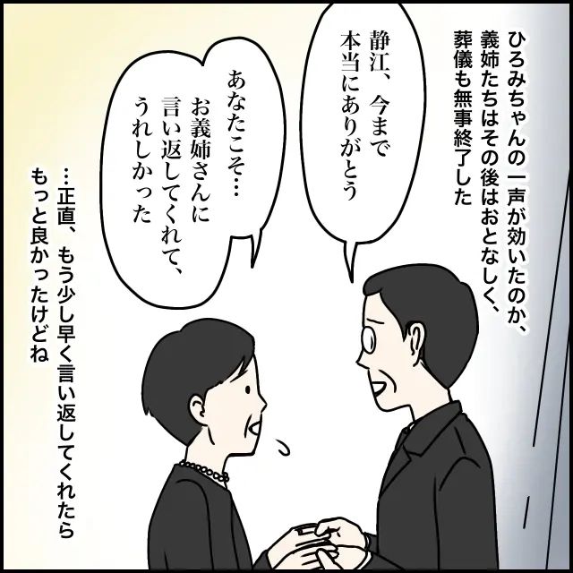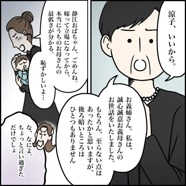 義姉たちが来てからひと月後、眠るように逝ってしまった義母。悲しみにくれる家族の前にあらわれた義姉たちは「あぁ疲れた」と何もしていないのに文句ばかり。吉子さんの娘ひろみちゃんがたしなめるも全く懲りず。その後、ひろみさんが私と涼子さんに挨拶すると、「ひろみはひ孫を見せられてほんと祖母孝行よね」と涼子さんに嫌味を言う義姉たちにひろみさんが反論!涙ぐむ涼子さんを見て、「この場で責めるようなことするなんて・・」と怒りがこみ上げました。