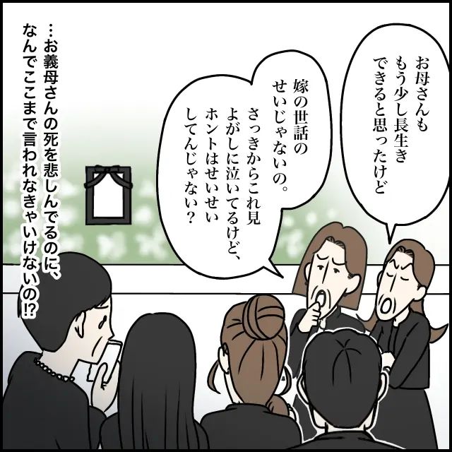 さらに、「お母さんも、もう少し長生きできると思ったけど」吉子さんがそう言うと、「嫁の世話のせいじゃないの。さっきから、これ見よがしに泣いてるけど、ホントはせいせいしてんじゃない?」吉美さんにそう言われ、「・・お義母さんの死を悲しんでるのに、なんでここまで言われなきゃいけないの!?」とますます怒りがこみ上げました。