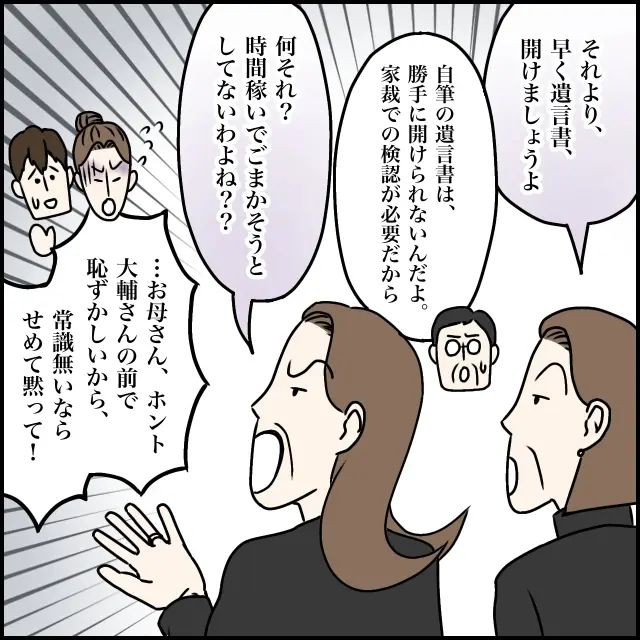 そんなとき、吉美さんが「それより、早く遺言書開けましょうよ」と言い出し、「自筆の遺言書は勝手に開けられないんだよ。家裁での検認が必要だから」夫がそう言うと、「何それ?時間稼いでごまかそうとしてないわよね??」と疑いの目を向ける吉子さん。ひろみちゃんは、「・・お母さん、ホント大輔さんの前で恥ずかしいから、常識無いならせめて黙って!」と怒り出しました。