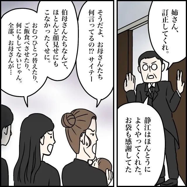 葬儀の最中、静江さんに文句を言い出す義姉たちを見て、訂正してくれ、と詰め寄る吉雄さん。涼子さんやひろみさんも義姉たちに不満がいっぱい!静江さんは、義母に対して誠心誠意お世話したことを伝えると、「それより早く遺言書を開けよう」と言い出して、ひろみさんは恥ずかしくなりました。葬儀が終わった後、「本当にありがとう」とお礼を言う吉雄さんに応えながら、「もう少し早く言い返してくれたら」と思う静江さん、本当に義姉たちには嫌な思いをさせられますよね。