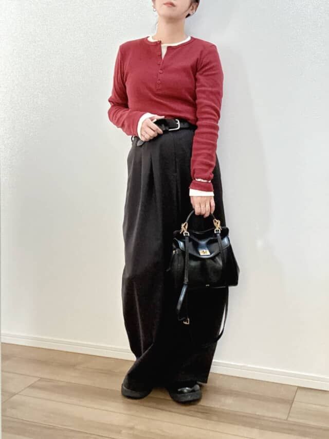 体のラインを拾いやすいカットソーは、骨ストさんには難易度が高め。ですが、「リブヘンリーネックT」はワンサイズ上げて選ぶことで程よいゆとりが生まれ、きれいなシルエットに整います。スッキリ感と着やすさを両立しつつ、赤を取り入れるだけで旬のムードに。人気カラーはすでに完売間近なので、ぜひ早めにチェックしてみてくださいね。<text&photo:Hiromi Anzai>