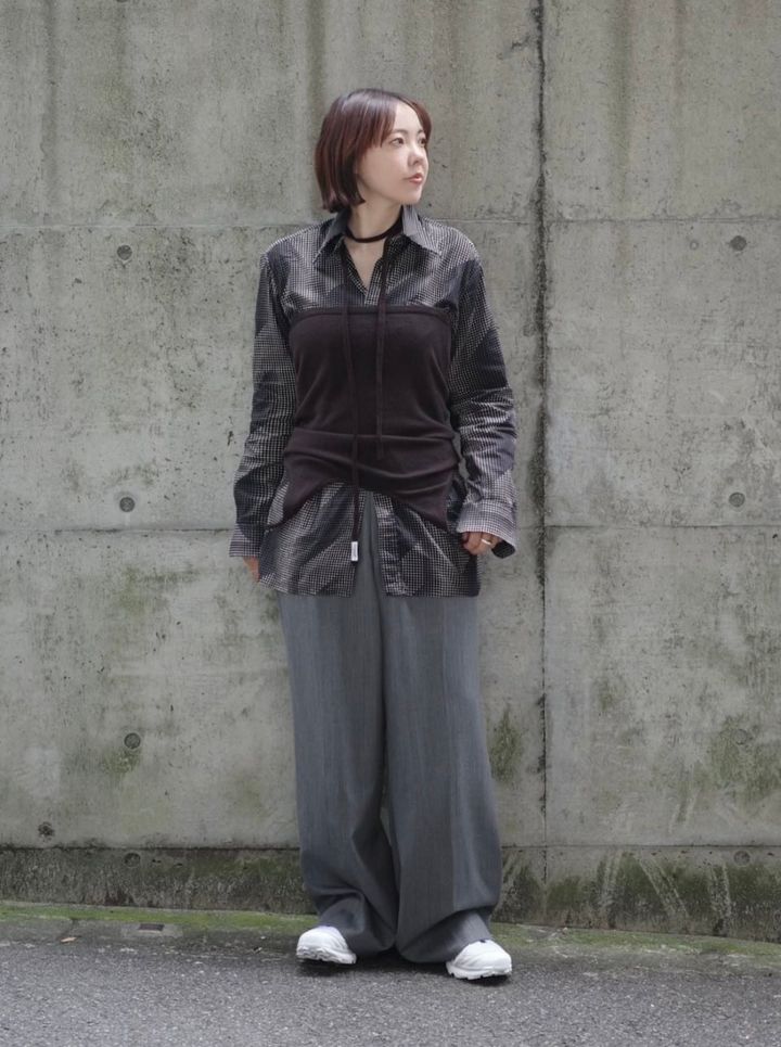 「ブラウン×グレーのシックな色合わせに、パキッと明るい真っ白なスニーカーを合わせメリハリのあるコーデに仕上げました。柄シャツにワイドめなスラックスというメンズライクなスタイリングですが、カシミアのキャミソールと小物で季節感をプラスしつつ、自分らしくアレンジ。スニーカーがハズシになるようなバランスにしたのもポイントです」