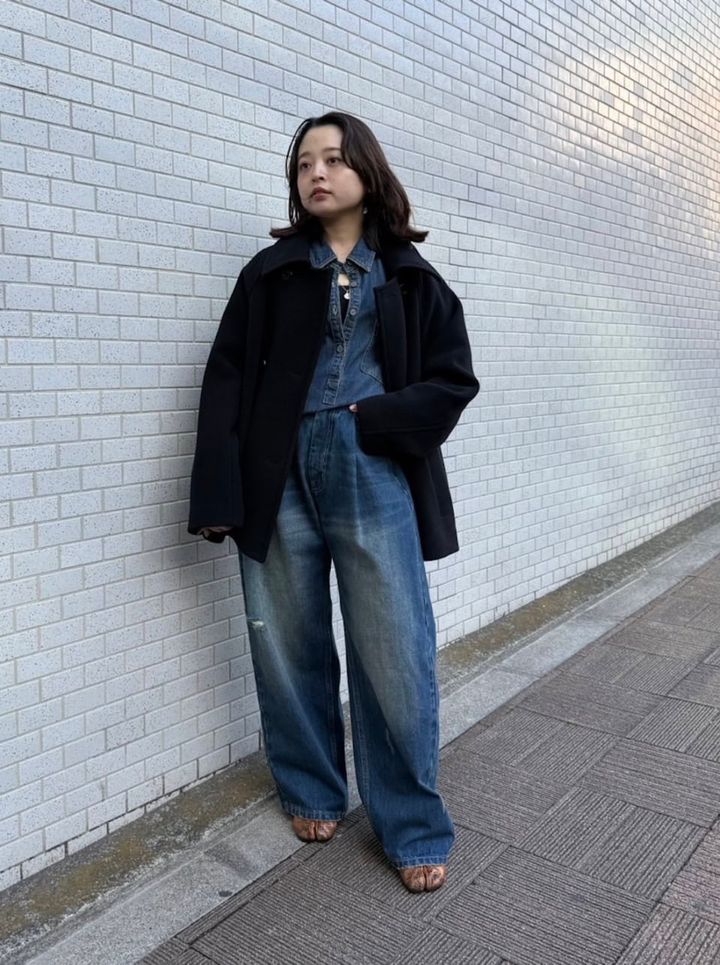 「なめらかなウール“Super160” の上質できれいなコートに、私が手掛ける『5 1/2(ファイブアンドハーフ)』のデニムセットアップを合わせて、素材感にコントラストを持たせたスタイリングに仕上げました。パンツは今季らしいバレルレッグのカーブシルエットで、ほどよいリラックス感とモードさをプラス。襟元は少しあけてヌケを演出し、スタイリング全体に女性らしさを添えました」