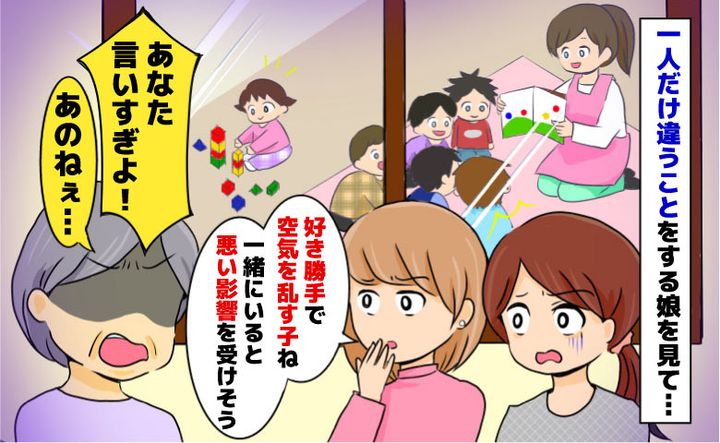 どうやら女性は園児を迎えに来たおばあちゃんのよう。男の子のママは、おばあちゃんに「今日たまたま見学させてもらってるんですけど、うちの子はいい子に輪に混ざってるのに、好き勝手遊んでばっかりの子がいて、ああいう子と一緒にいると悪い影響受けそうだなって」と言うのです。散々な言われように耐えられず、帰ろうと思ったそのとき、おばあちゃんが「そりゃ、あなた言い過ぎよ!」と叱責。続けて「まだ1歳くらいでしょう? いろんなものに興味があって当然よ。あなたのお子さんは絵本に興味があった、そしてあの子は他のおもちゃに興味があった。それだけじゃない? うちの孫も最初は先生の示すことよりも他のことばっかりしてたわ。でももしあなたみたいに他の保護者の人から思われてたら悲しいわね」と言います。