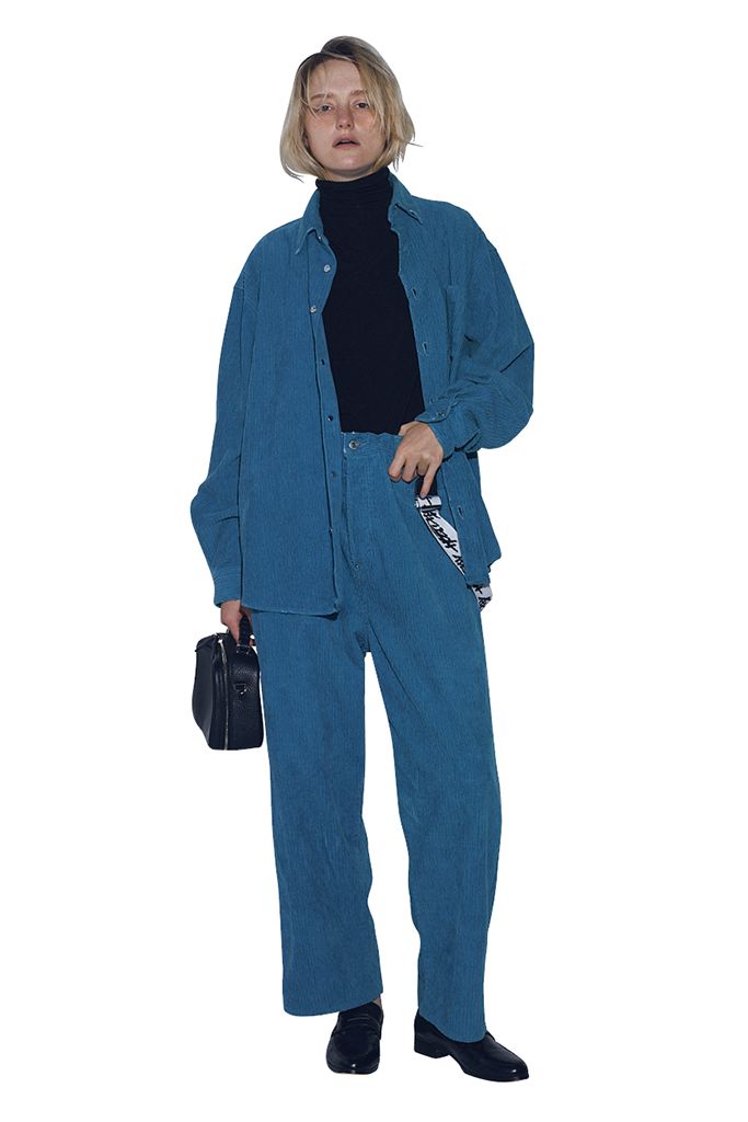 黒タートルネックトップス/LE PHIL(LE PHIL NEWoMan 新宿店) ブルーコーデュロイシャツ、ブルーコーデュロイサスペンダーパンツ/ともにHOLIDAY