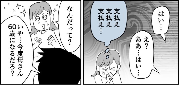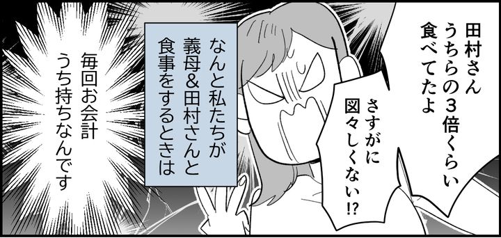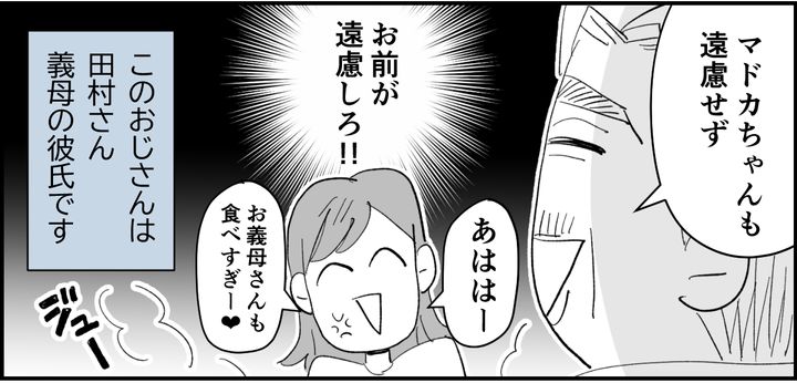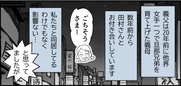 義母に恋人ができたら、その相手との付き合いはどうしたらいいのでしょうか? まったく接点を持たないか、逆に家族のように付き合う人もいるかもしれませんね。わが家の場合、義母の恋人とは数ヶ月に1回、食事に行くような関係です。それだけだったら構わないのですが……義母の恋人・田村さんにはひとつ問題がありました。最初は我慢していた私も、徐々に耐えきれなくなってきて。それぞれの家族を巻き込んだ「大騒動」になったのでした。