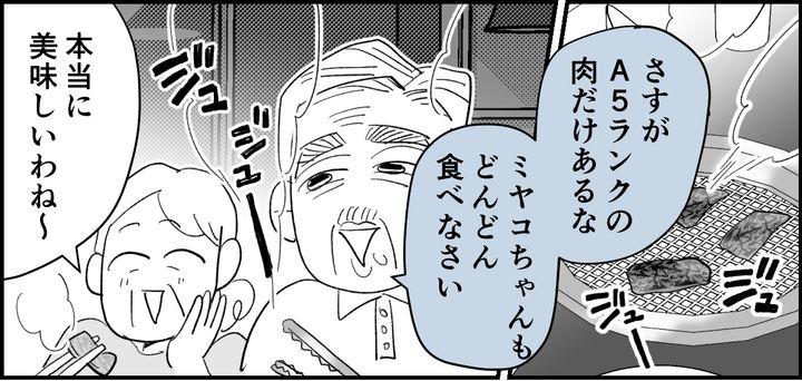 <義母の彼氏サイフ出さない>焼肉!A5ランク食べ放題!支払いは…「うちか〜い!」【まんが】