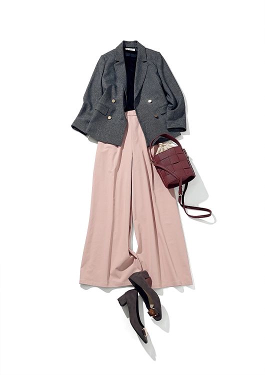 ベロアカットソー¥11,000/ストロベリーフィールズ(シュガー・マトリックス) ピンクワイドパンツ¥23,100/アルページュストーリー ジャケット¥8,998/ロペピクニック(ジュン) スクエアパンプス¥9,900/RANDA スカーフ¥16,500/マニプリ