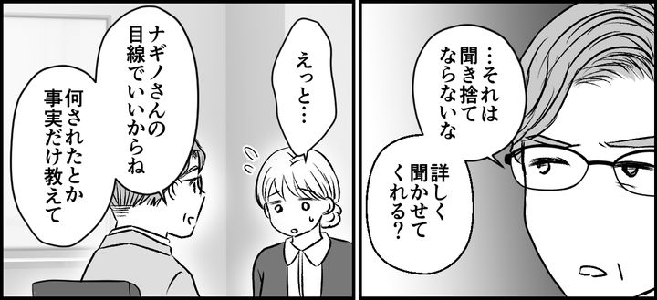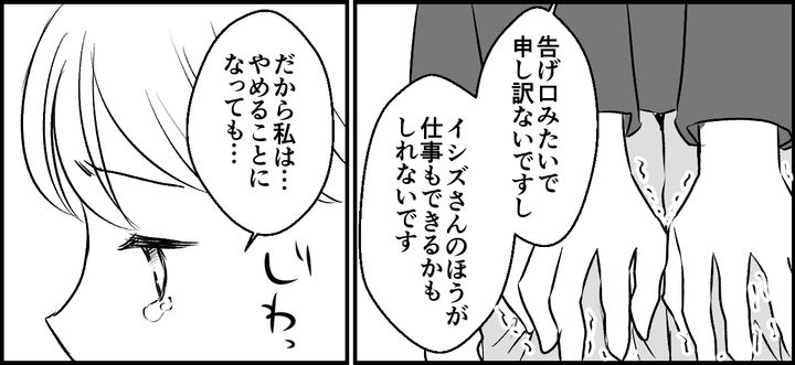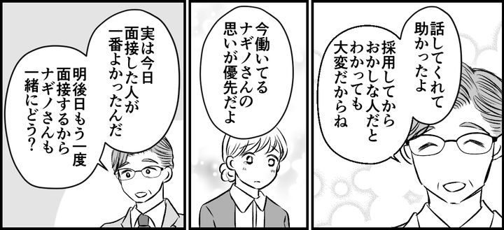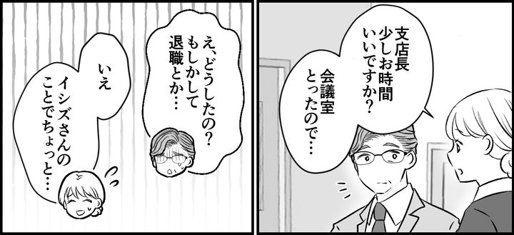 「これから採用する人は、ナギノさんの相棒になる人だから、ナギノさんの意見も聞かせて」と、言ってくれた支店長。私は勇気を振り絞って過去に、イシズさんの嫌がらせが原因で前の会社を退職したことを話しました。