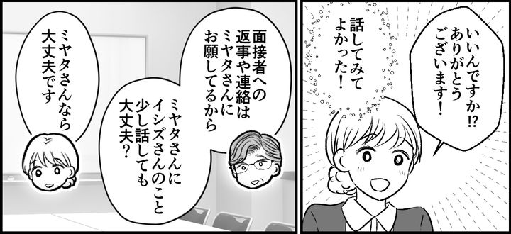 私は支店長にどう思われるか、どう受け取られるかすごく不安でした。それに、イシズさんのことを話すということは過去を思い出すということなのでツラかったです。でも支店長の反応を見ると、がんばって話してよかったと思える結果でした。