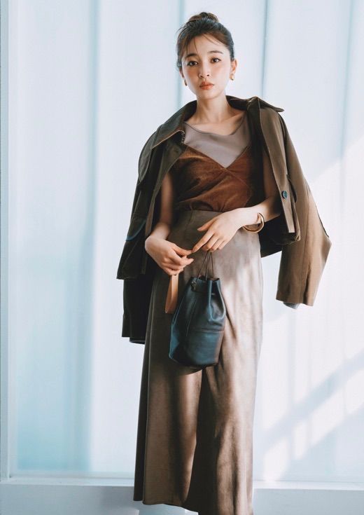 10月27日(月)、トレンドのカーキアイテムを女性らしく着たい日は、同系色のアースカラーでまとめるのが正解。ベロアキャミとシアーインナーのレイヤードで、素材の艶と透け感が上品な抜けを演出してくれます。黒の巾着バッグでほんのり辛口に、ゴールドアクセでウォームトーンを引き締めて。落ち着いた色合いのグラデトーンが、秋のしっとりムードを引き立てるコーデです。