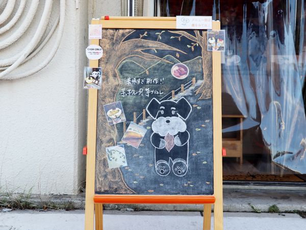 お店の外にある手描きの看板は、伊藤さんの作品。季節ごとに絵が変わります。イラストの犬は、伊藤さんの愛犬がモデルなんだそうです。こだわりのドリンクとおいしいクレープが食べたくなったら、かわいい看板を目印に、買い物帰りにふらっと立ち寄ってみてください。