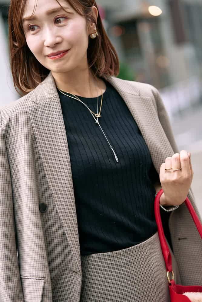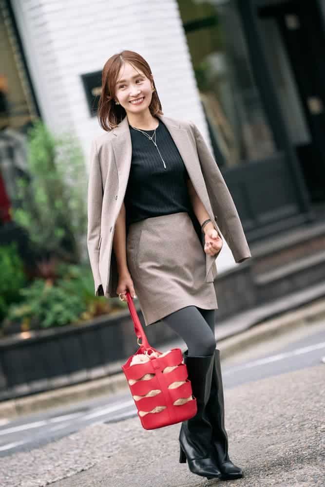 秋になるとつい気になるチェック柄、インナーにはTシャツ感覚で着られるユニクロのシンプルな黒リブニットを。今日はジャケットとスコートのセットアップで、きちんと感のある大人可愛いスタイルにしてみました。足元はワイドブーツでバランスをとりつつ、赤バッグでコーデに華やかさをプラスしました。なみなみデザインのバッグからちらりとのぞくファーで、季節感も忘れません。