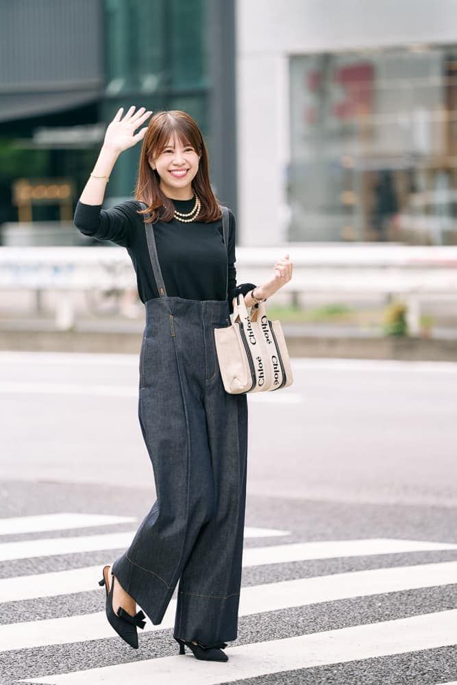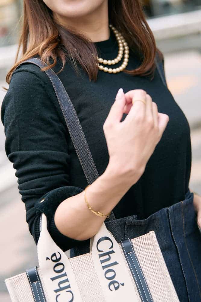 1枚持っていると便利なUNIQLO定番商品のメリノクルーネックセーター。数年前に購入しましたが今も現役です。薄手なのでサロペットスタイルでもスッキリ着こなせます。シンプルなニットには、パールネックレスを二連にして顔周りに華やかさをプラスしたり、ロゴバッグを合わせるなど小物でアクセントをつけています。