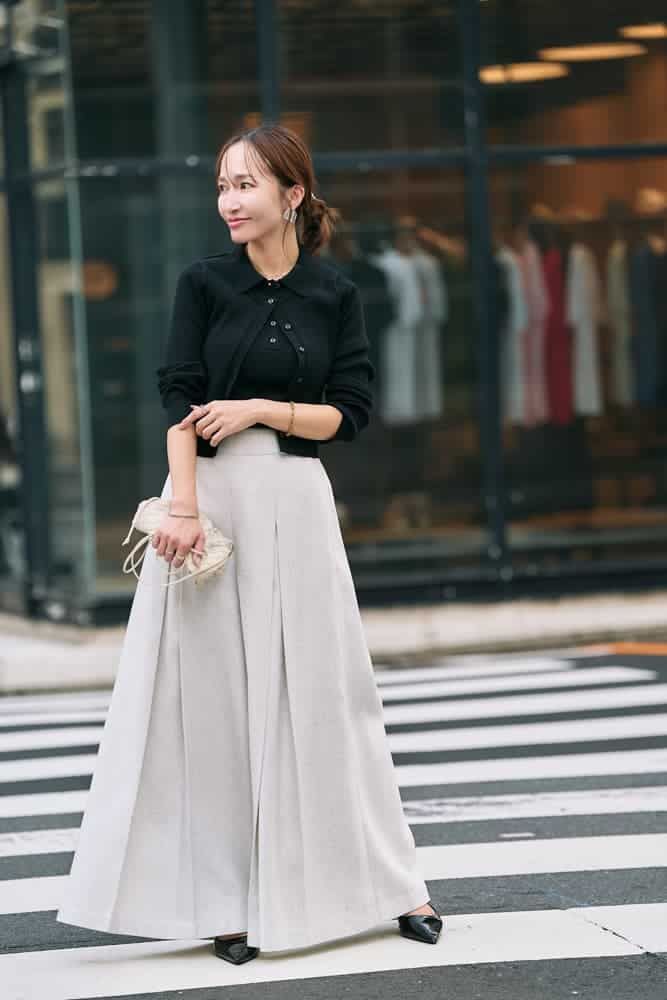 GUの黒ニットは、実はポロタンクとカーディガンのセットという優秀アイテム。トレンドのポロデザインをきちんと感のあるスタイルで取り入れました。コンパクトなトップスにワイドパンツを合わせて、シルエットにメリハリをプラス。シンプルなのに今っぽく、こなれた印象に仕上がるお気に入りコーデです。