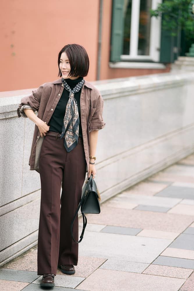 毎年ベーシックカラーを中心に買い足ししているニットを軸に、今年トレンドのブラウンを合わせてコーディネート。スカーフは大好きなアイテムの一つで、自宅で洗える素材なので汚れを気にせず腰巻きにしたり首にまいて楽しんでいます。プチプラブランドのお手頃なアイテムを着る時は、一目でブランドが分かるデザインのハイブランドアイテムは合わせないのがマイルールです。