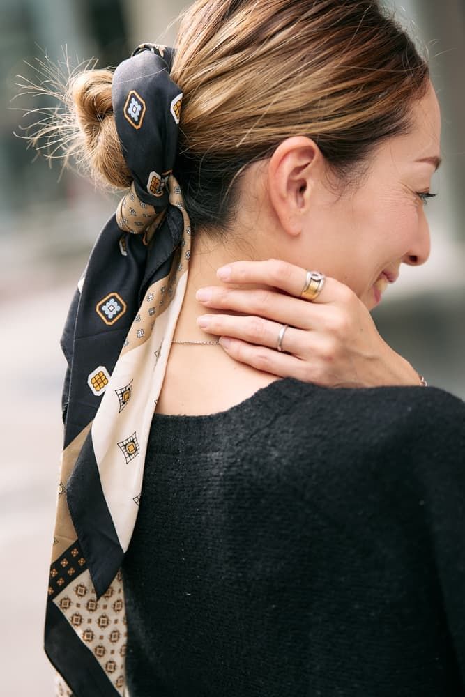 いつものワンツーコーデ×スカーフで華やか上品に
