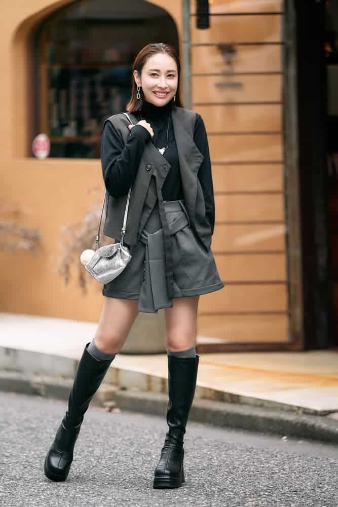 シンプルなニットにはジレなどを重ねて表情を変えて着るのが私の定番。今回は上下ZARAのグレーで、ワントーンでも奥行きのあるコーデに仕上げました。同じ色味でも少しずつトーンを変えるだけでぐっとおしゃれ見え♡秋はまだ暑い日もあるので、素足×ロングブーツで季節感と抜け感のバランスをとっています。