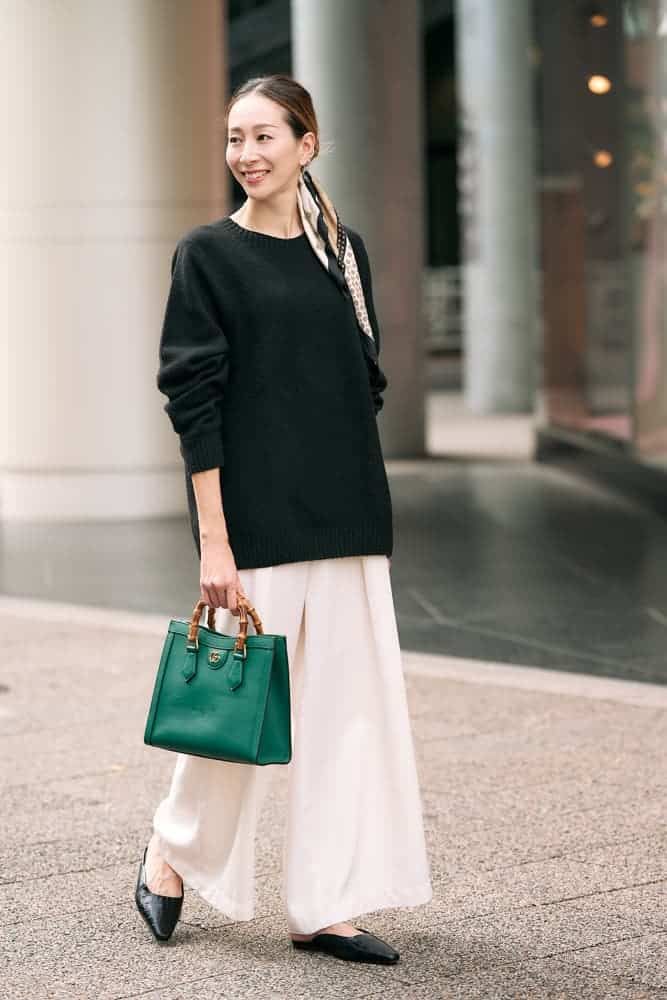 定番の黒ニットはあえてメンズのXLをチョイス。ゆるっとしたサイズ感で白のワイドパンツと合わせ、大人の抜け感を意識しました。広めのネックラインには、スカーフを髪に巻いて揺れ感と華やかさをプラス。仕上げにグリーンバッグを差し色にして、抜けすぎず上品にまとめた秋のこなれコーデです。