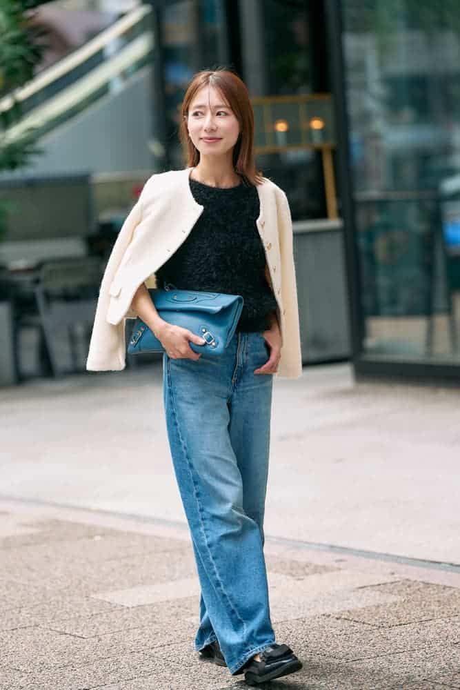 秋コーデには少しの肌見せで女性らしさを。プチプラながらも高見えするGUニットは今の気分にぴったり。気温差のある季節には羽織はマストなので差し色としてホワイトのジャケットを肩がけしてコーデに立体感を出しました。こなれ感と色をプラスできるバレンシアガのバッグを合わせれば、秋おしゃれも大人っぽく上品にまとまります。