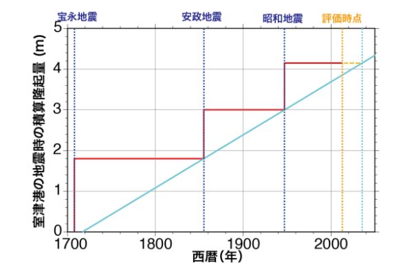 その材料になったのが、高知県の室戸岬に近い室津港の港番をしていた久保野家に代々伝わる古文書です。そこには江戸時代からの室津港の水深が書かれており、地震によって隆起した様子がうかがえました。これにより1707年の宝永地震や1854年の安政地震の隆起量も具体的にわかります。ここでは隆起量がひずみの解放量、つまり先ほどの例えで言えば「支払った金額」に当たるわけです。