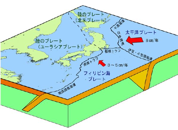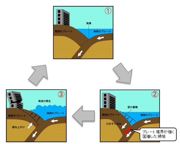 南海トラフでは、海のプレートが少しずつ沈み込んでいるため、下の図のようにプレートの境界部分に少しずつひずみがたまり、ある程度の限界を超えると一気にプレート境界がずれて地震や津波が起きると考えられています。